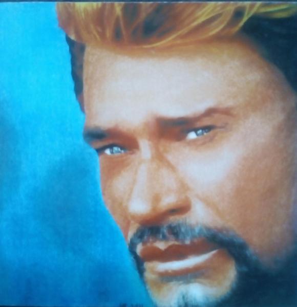 Portrait de Johnny Halliday dessiné aux crayons pastels secs sur papier 50x50 cm. Fait en 2011.